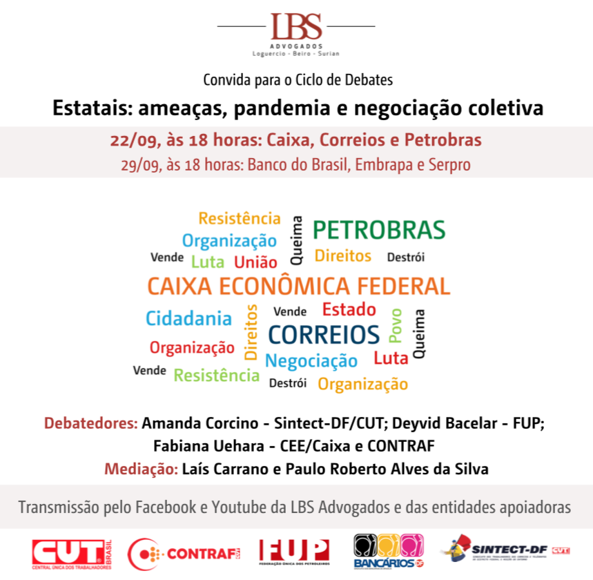 Nas próximas terças-feiras, dias 22 e 29, a LBS Advogados, escritório que assessora juridicamente o Sindicato, convida os trabalhadores das estatais para um debate sobre as ameaças, pandemia e negociações coletivas. Os encontros, marcados para as 18h, serão transmitidos pelas redes sociais do Sindicato e da LBS. O primeiro ciclo tratará dos desafios da Caixa, dos Correios e da Petrobras.