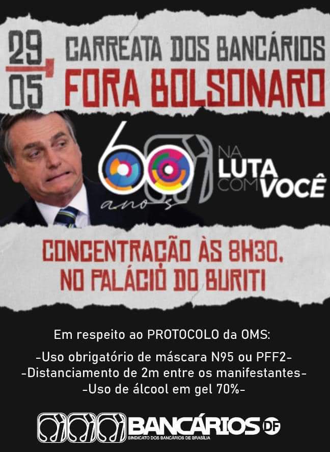 Hoje, mais de 450 mil famílias choram pela perda de pessoas que poderiam estar aqui, não fosse o descaso com que o presidente da República conduz a maior crise sanitária das últimas décadas. Neste sábado (29), a partir das 8h30, bancários e bancárias da capital federal se juntam a milhares de brasileiros para protestar contra o desprezo de Bolsonaro pela vida.