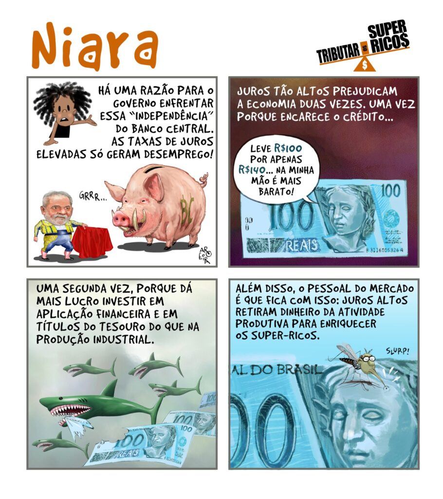 A discussão sobre a "independência" do Banco Central tomou conta da pauta jornalística depois que o presidente Lula criticou a taxa de juros em 13,5%, a mais alta do mundo. Na tirinha da Niara desta semana, ela demonstra como essa taxa só beneficia especuladores financeiros, além de aumentar o desemprego.