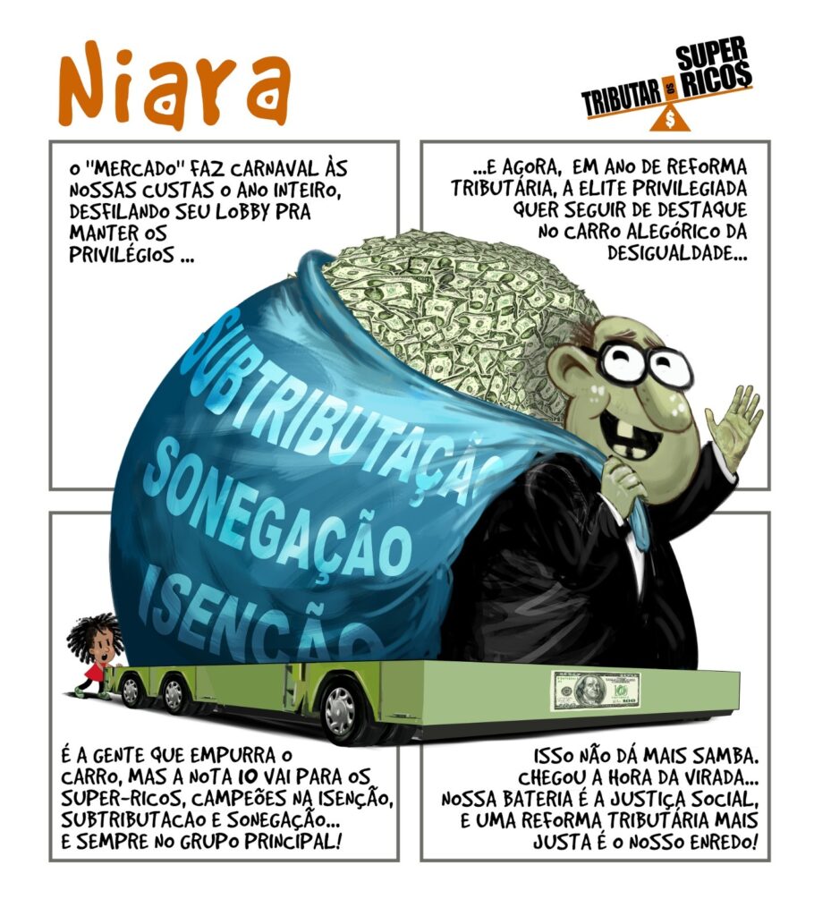 Para as entidades que promovem a campanha Tributar os Super-Ricos, o carnaval da injustiça social, que faz a festa dos endinheirados o ano inteiro, não dá mais samba. “Chegou a hora da virada… Nossa bateria é a justiça social, e uma reforma tributária mais justa é o nosso enredo”, diz Niara, a mascote que agita na avenida a bandeira da luta por justiça tributária.