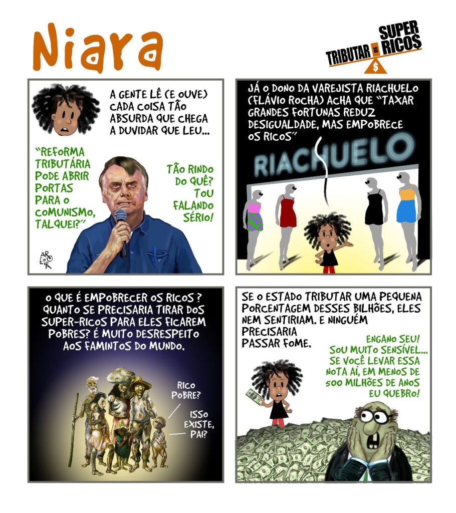“A gente lê (e ouve) cada coisa tão absurda que chega a duvidar que leu…”, diz Niara, a mascote da campanha Tributar os Super-Ricos, diante das balelas disseminadas por quem não quer justiça tributária no país, para seguirem ampliando sem limite seus lucros e fortunas, enquanto milhões de brasileiros são condenados à pobreza, à miséria e à fome.