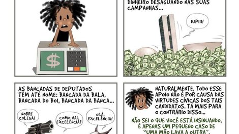 Em seguida, a personagem alerta: “candidatos ligados ao poder econômico têm rios de dinheiro desaguando nas suas campanhas”.
