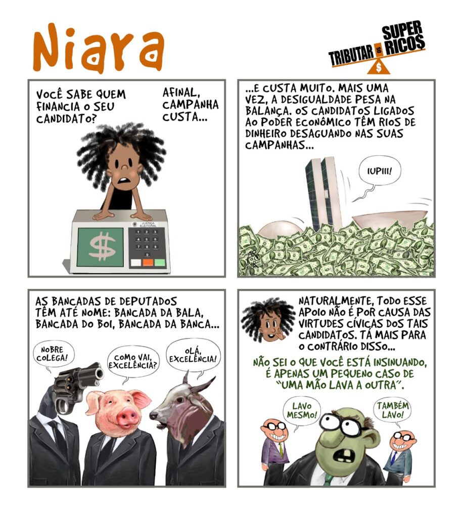 As histórias em quadrinhos com a mascote Niara são publicadas as sextas-feiras pelas representações sociais que integram a campanha Tributar os Super-Ricos, entre as quais o Sindicato dos Bancários de Brasília.