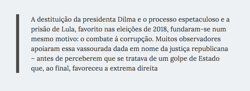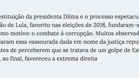 No sistema judiciário brasileiro, policiais, procuradores e juízes formam corpos independentes uns dos outros. A polícia reúne as provas, os procuradores proferem as acusações e os juízes arbitram as penas (no Brasil, os júris populares só intervêm em casos de homicídio). Todavia, na prática, as três funções se fundiram na ocasião da Lava Jato, quando a polícia e os procuradores trabalharam sob a supervisão do juiz que controlou as investigações, determinou as penas a serem cumpridas e as pronunciou: uma inegável negação dos mecanismos básicos da justiça, que preveem a separação da acusação e da condenação (sem mencionar o fato de o juiz Moro ter varrido de uma hora para outra o princípio da presunção de inocência).