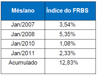 Para a maioria de integrantes do REG/Replan, que optou pelo Saldamento, além do reajuste real de 9%, para assistidos, e 10,79% no benefício saldado dos participantes ativos, aplicados no ato da adesão ao saldamento, e de mais 4%, aplicados sobre o benefício de setembro/2006, foram promovidas diversas revisões, a partir de janeiro/2007, com base no Fundo de Revisão do Benefício Saldado (FRBS), previsto no Art. 115 do regulamento do plano, conforme quadro a seguir: