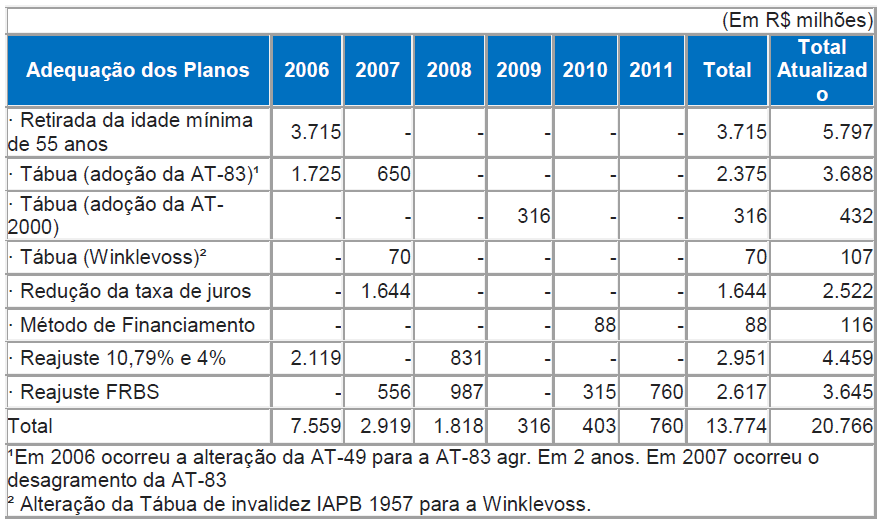 O custo dos reajustes, bem como os de várias medidas prudenciais e de adequações de premissas e hipóteses atuariais levadas a termo nos últimos sete anos, foram suportados exclusivamente com recursos dos próprios planos, sem que houvesse necessidade de contribuições adicionais de seus integrantes, incluindo a patrocinadora. A tabela a seguir mostra quanto foi dispendido em cada um dos ajustes, incluindo os reajustes reais, em valores atualizados pelo INPC até julho/2014.