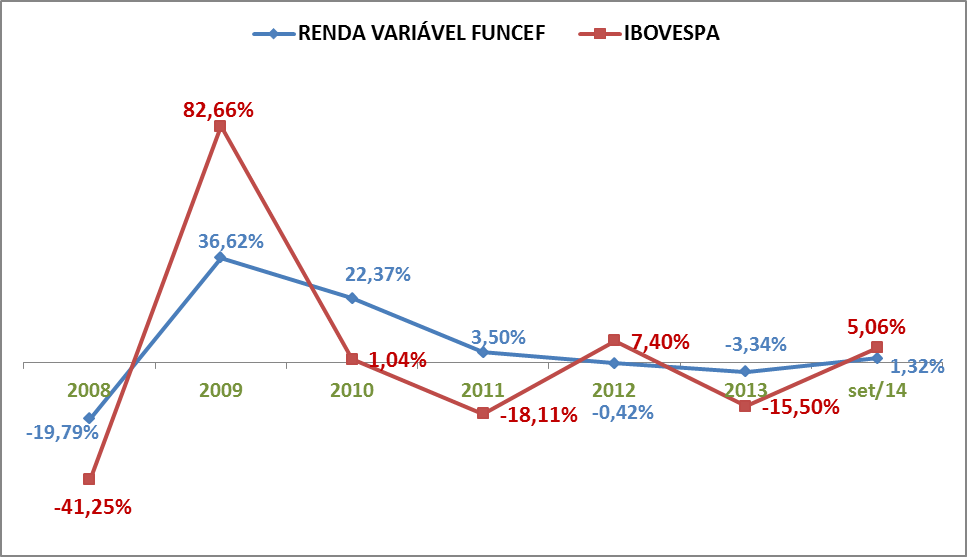 Para ajudar na compreensão dos impactos negativos da crise no segmento de renda variável, apresentamos abaixo o comportamento da Bolsa de Valores de São Paulo, medido pelo Ibovespa, desde 2008. Até setembro de 2014, o índice apresentou uma variação negativa de 15%. A rentabilidade da FUNCEF no segmento de renda variável foi de 35%. No mesmo período a meta atuarial dos planos da FUNCEF se acumulou em 110,78%.