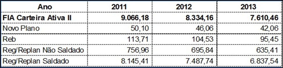 Para melhor compreensão dos efeitos desse investimento no resultado dos planos de benefícios da FUNCEF, em especial do REG/Replan, que detém a maior fatia dele, o valor de avaliação do FIA Carteira Ativa II caiu de R$ 9,0 bilhões, em 31/12/2011, para R$ 7,6 bilhões, em 31/12/2013. Ou seja, uma redução de 16%, conforme dados do quadro abaixo.
