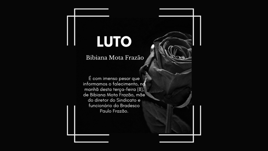 É com imenso pesar que informamos o falecimento, na manhã desta terça-feira (8), de Bibiana Mota Frazão, mãe do diretor do Sindicato e funcionário do Bradesco Paulo Frazão.