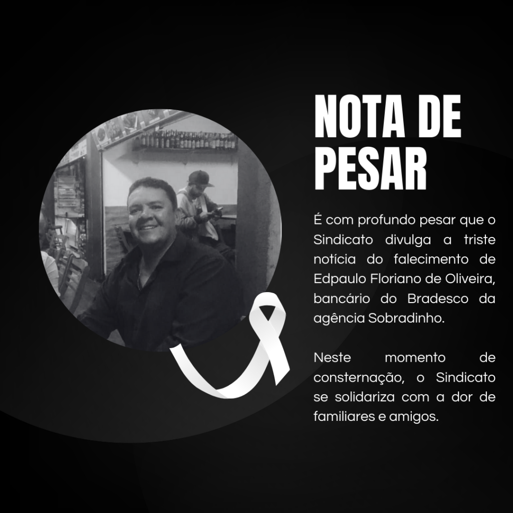 É com profundo pesar que o Sindicato divulga a triste notícia do falecimento de Edpaulo Floriano de Oliveira, bancário aposentado do Bradesco da agência Sobradinho (antigo HSBC). Funcionário do banco há 18 anos, Edpaulo deixa esposa e duas filhas.