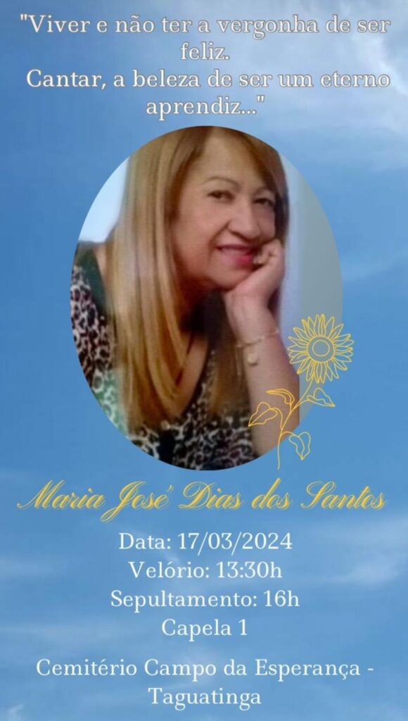 O velório acontece desde as 13h30 deste domingo na capela 1 do Cemitério de Taguatinga, onde ocorrerá o sepultamento às 16h.