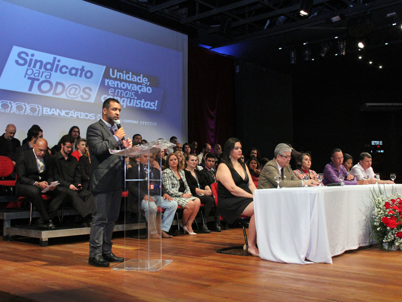 A nova diretoria do Sindicato tomou posse para o triênio 2016-2019, nesta quarta-feira (29), e reafirmou seu compromisso de defender os interesses da categoria bancária, ampliando suas conquistas, além de enfrentar as adversidades do momento, em que o atual governo ameaça a democracia e os direitos dos trabalhadores. A solenidade foi prestigiada por centenas de bancários, dirigentes sindicais e representantes da sociedade civil, na sede da entidade sindical.