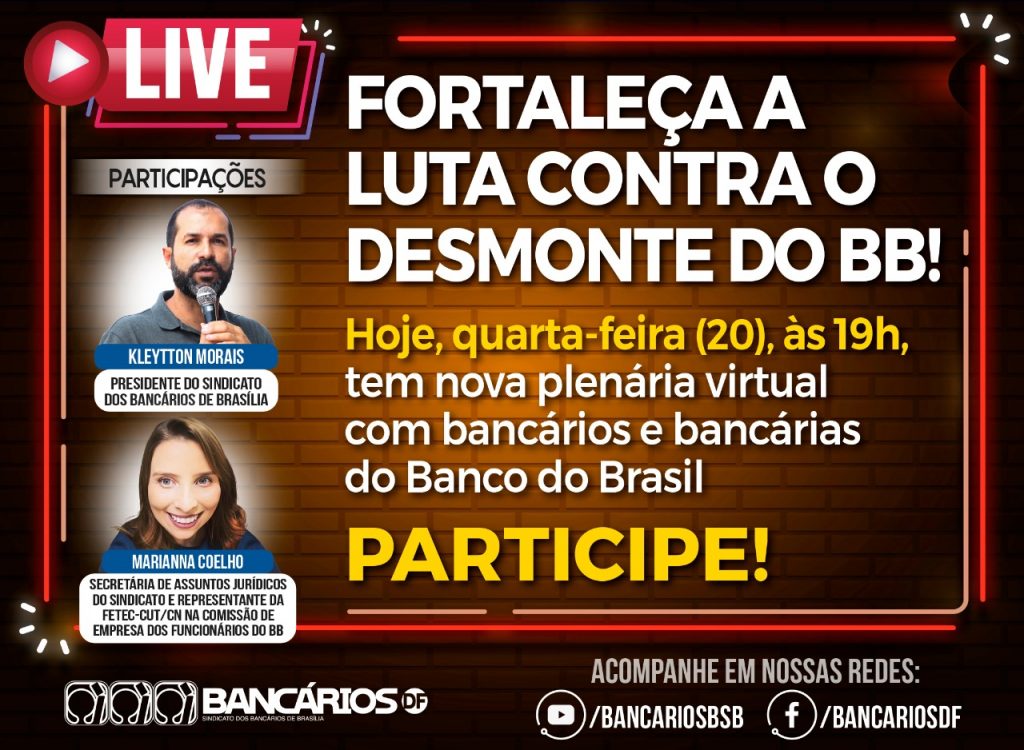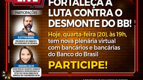 O Sindicato dos Bancários de Brasília convida bancárias e bancários do Banco do Brasil a participarem de importante Plenária virtual que acontece nesta quarta-feira (20).