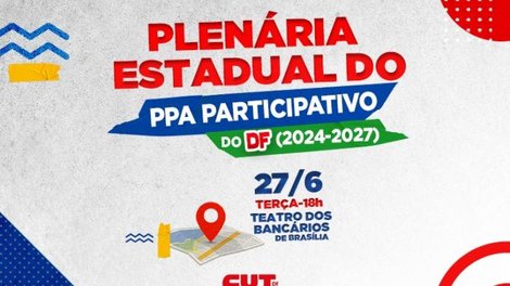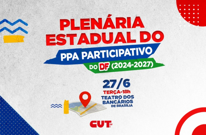 Na próxima terça-feira (27), acontece a Plenária Estadual do Plano Plurianual Participativo (PPA) do Distrito Federal para o período de 2024 a 2027. A atividade tem o objetivo de entender os anseios da população e remanejar o orçamento para as áreas que mais necessitam de investimentos públicos, por isso, a CUT-DF convoca todas as entidades filiadas para participar do evento, que será a partir das 18h no Teatro do Sindicato dos Bancários de Brasília.
