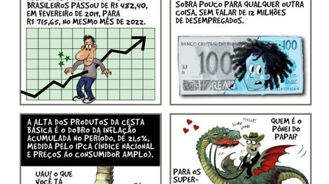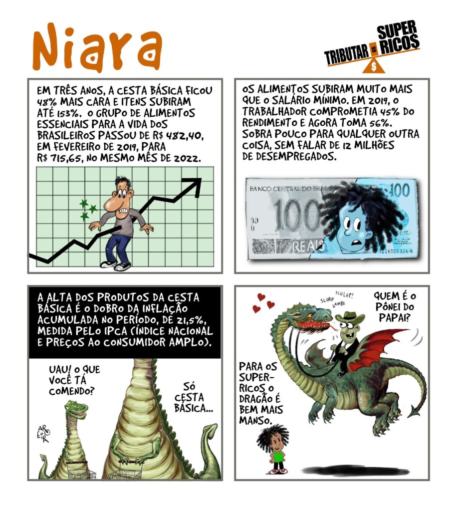 Niara, a mascote da campanha “Tributar os Super-Ricos”, protesta contra a corrosão dos salários pela disparada dos preços dos produtos da cesta básica – alta de 21,5% pelo IPCA (Índice Nacional e Preços ao Consumidor Amplo), em 12 meses.
