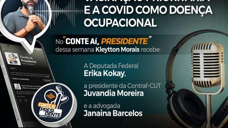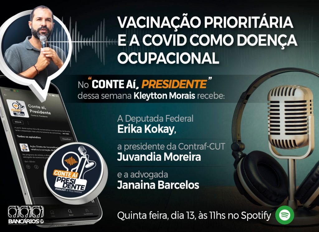 O presidente do Sindicato, Kleytton Morais, recebe nesta quinta-feira (13), no podcast “Conte aí, Presidente”, a deputada federal Erika Kokay, a presidente da Contraf-CUT, Juvandia Moreira, e a advogada Janaina Barcelos. A discussão será sobre vacinação prioritária e Covid como doença ocupacional. A gravação irá ao ar às 11h, pelo Spotify.