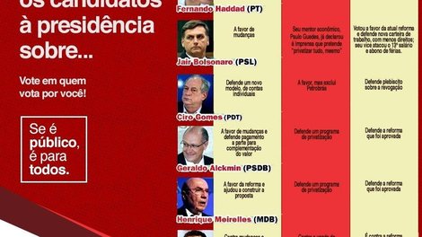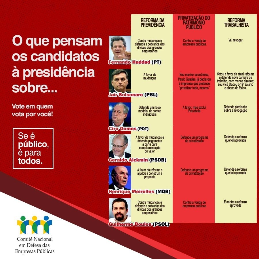 Veja, no quadro, alguns dos posicionamentos dos candidatos sobre privatizações, reforma trabalhista e Previdência, três itens que, com certeza, têm impacto fundamental no dia a dia dos brasileiros.