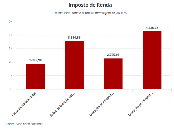 De acordo com o Sindifisco Nacional, se toda a defasagem tivesse sido reposta, a faixa de isenção para o Imposto de Renda seria aplicada para quem ganha até R$ 3.556,56. O desconto