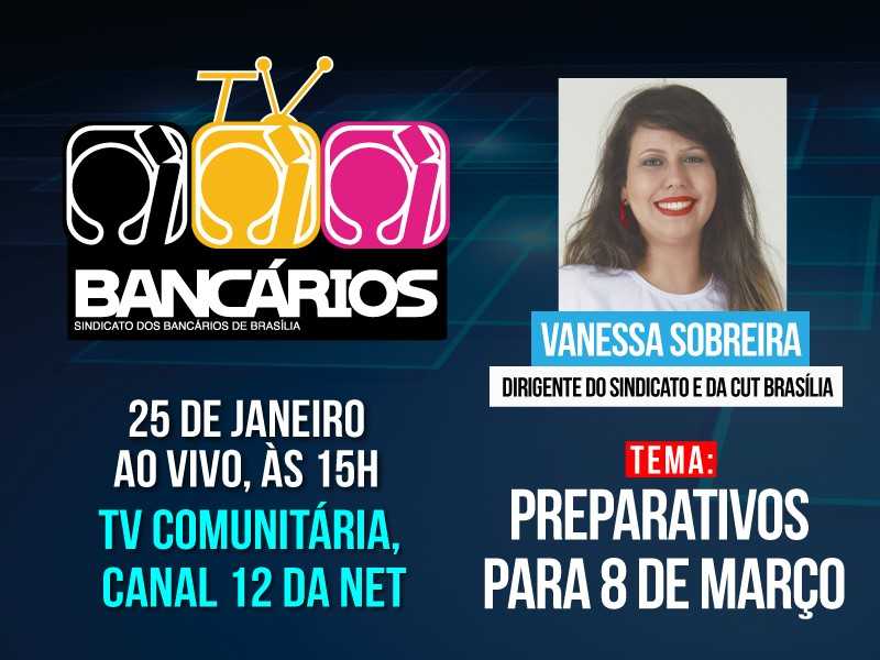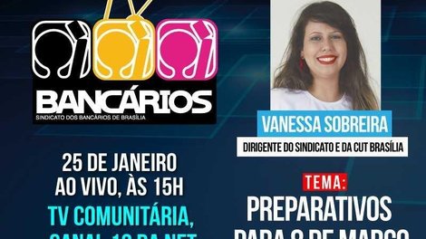 Nesta sexta-feira (25), o TV Bancários apresenta a entrevista com Vanessa Sobreira, dirigente do Sindicato e da CUT Brasília, sobre os preparativos para o 8 de março no Distrito Federal. O programa da TV Comunitária vai ao ar a partir das 15h pelas redes sociais do Sindicato e pelo canal 12 da Net.