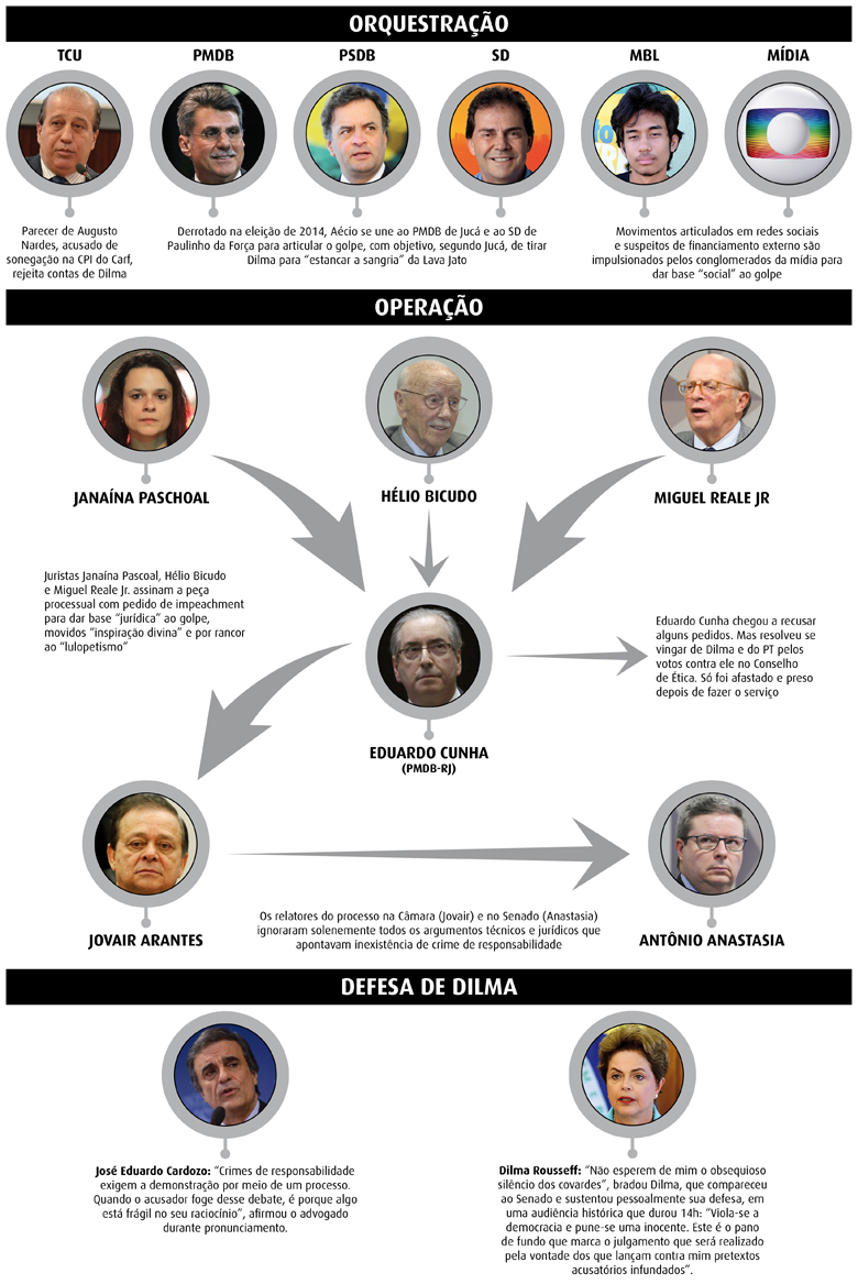 O pedido de impeachment foi elaborado pelos juristas Janaína Paschoal, Miguel Reale Jr, que foi ministro da Justiça no governo Fernando Henrique Cardoso, e Hélio Bicudo, que chegou a ser vice-prefeito de São Paulo no governo de Marta Suplicy (do PT, entre 2001 e 2005). "Eu acho que a saída da Dilma não vai gerar trauma algum. As pessoas vão respirar fundo, dizendo: 'Puxa, saiu'", previu Bicudo em entrevista ao programa Roda Viva, da TV Cultura, em setembro do ano passado.