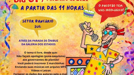 Ícone do carnaval de rua do Distrito Federal, o Pacotão mantém viva a tradição da sátira política e da irreverência popular também no pós-carnaval. O bloco promove, no sábado, dia 7 de fevereiro, o tradicional Concurso de Marchinhas, e volta às ruas na terça-feira, dia 17, com seu já conhecido desfile na contramão da W3.
