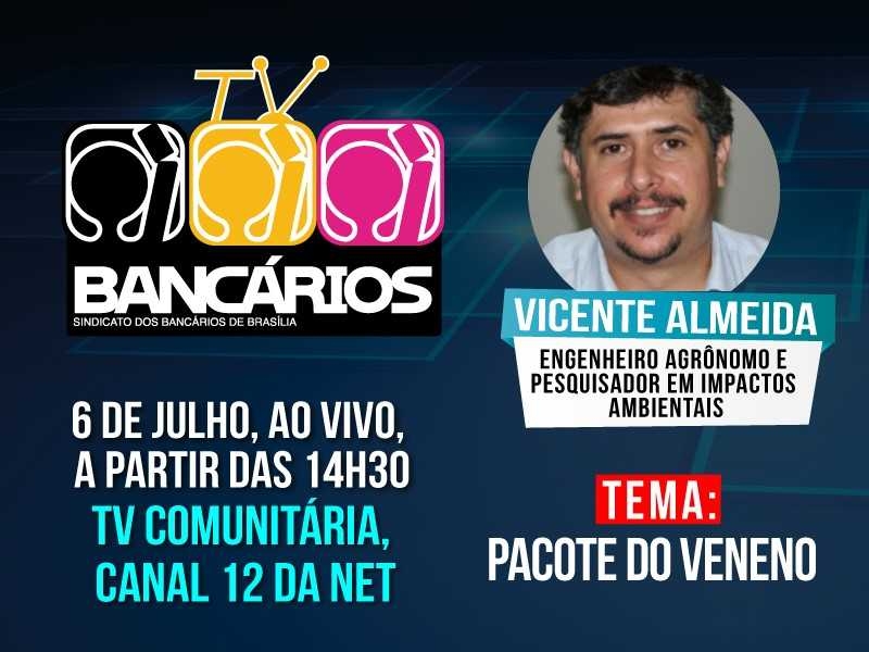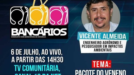 Contra a sanha da bancada ruralista, que tenta forçar a aprovação do Projeto de Lei 6299/02 no Congresso Nacional, o TV Bancários desta semana coloca o Pacote do Veneno em discussão nesta sexta-feira (6). Como convidado, o programa recebe o engenheiro agrônomo e pesquisador em impactos ambientais, Vicente Almeida. O TV Bancários vai ao ar às 14h30 pelas redes sociais do Sindicato e pelo canal 12 da Net.