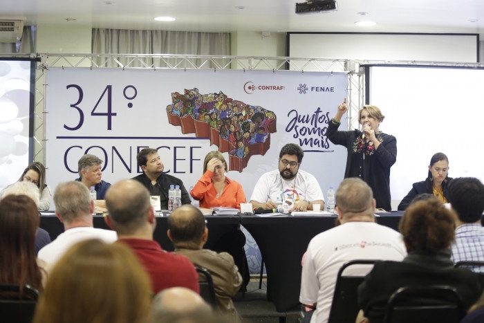 Reunidos em São Paulo, os delegados do 34º Congresso Nacional dos Empregados da Caixa Econômica Federal (Conecef) debateram na tarde desta quinta-feira (7) os ataques ao banco. O painel “Caixa 100% pública” contou com a participação da deputada federal Erika Kokay (PT-DF); da representante dos empregados no Conselho de Administração do banco e diretora da Fenae, Rita Serrano; e de Felipe Miranda, do Dieese, assessor da Federação. Após o debate, foi lançado o livro “Caixa, banco dos brasileiros“, da Coleção Fenae.