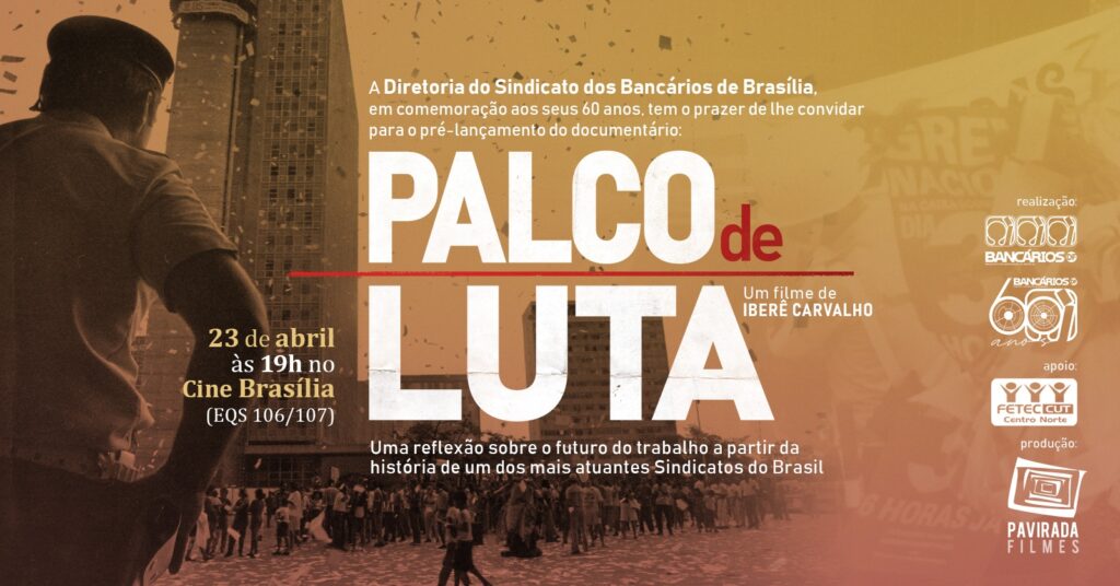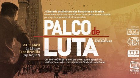 O Sindicato completou 60 anos. E é tanta história para contar, tantos motivos para celebrar que as comemorações terão início neste sábado (23), com o pré-lançamento de um documentário imperdível sobre as seis décadas de existência. A partir das 19h, na tela do Cine Brasília (EQS 106/107), ‘Palco de Luta’ reúne depoimentos de quem fez e faz parte da trajetória exitosa do Sindicato. A cerimônia será conduzida pela atriz Lucélia Santos.