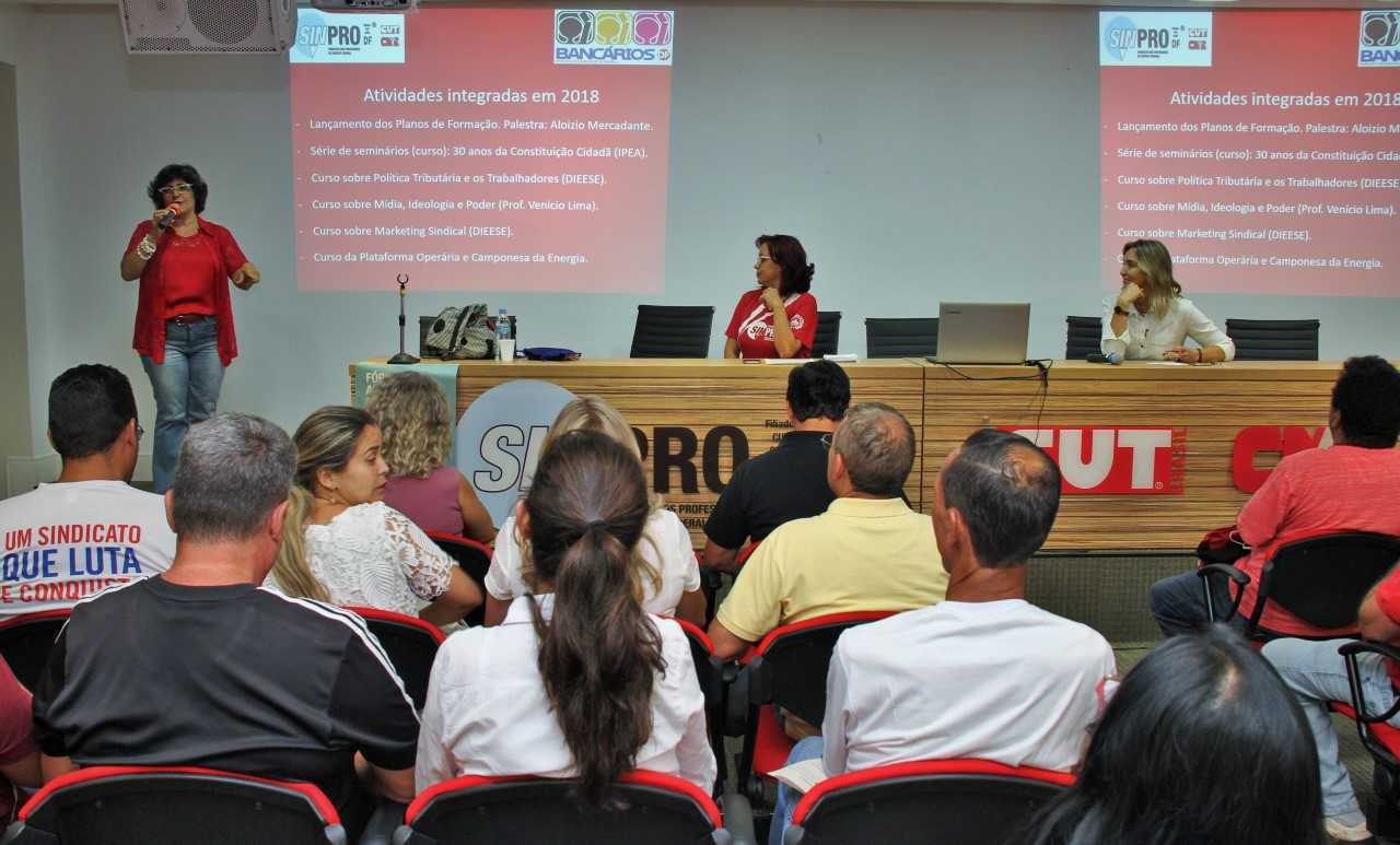 A secretária da Formação do Sindicato dos Bancários, Teresa Cristina, compôs a mesa do debate com as dirigentes do Sinpro-DF Rosilene Corrêa e Luciana Custódio. O presidente do Sindicato, Eduardo Araújo, contribuiu com as discussões. Estivem presentes também as diretoras Marianna Coelho, da secretaria de Assuntos Jurídicos; Raissa Fraga, da secretaria da Juventude; e o diretor Kleytton Morais.