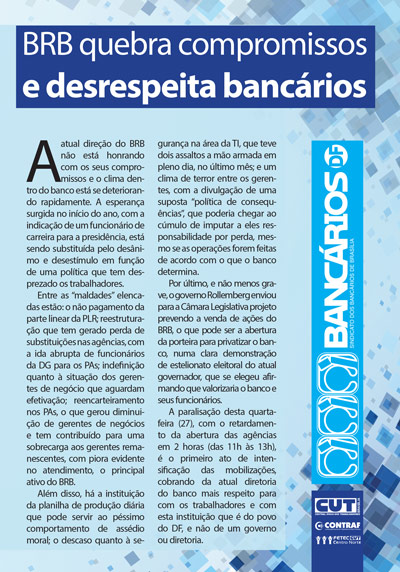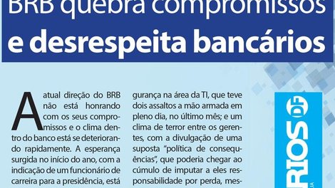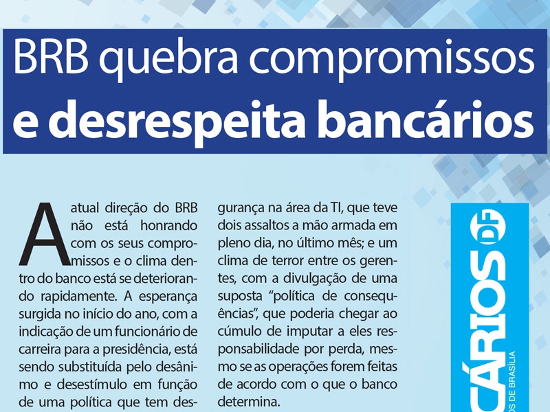 A atual direção do BRB não está honrando com os seus compromissos e o clima dentro do banco está se deteriorando rapidamente. A esperança surgida no início do ano, com a indicação de um funcionário de carreira para a presidência, está sendo substituída pelo desânimo e desestímulo em função de uma política que tem desprezado os trabalhadores.