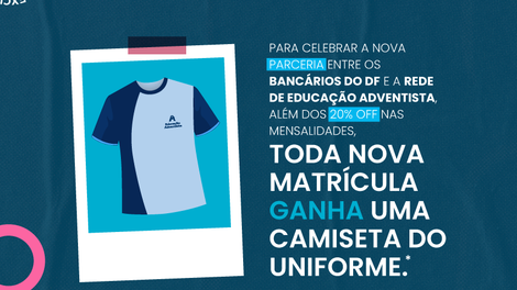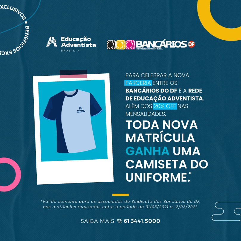 Bancários sindicalizados têm 20% de desconto nas mensalidades no Colégio Adventista. O benefício é apenas uma das vantagens da parceria entre o colégio e o Sindicato. Até 12 de março, os sindicalizados também garantem uma camiseta do uniforme no ato da matrícula.