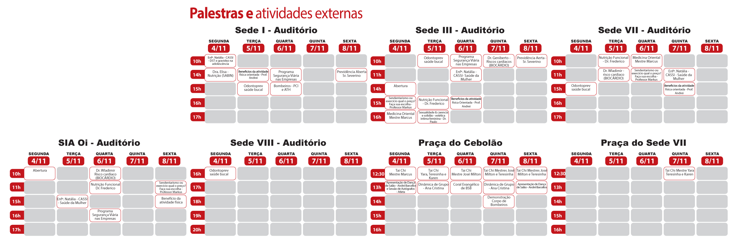 Durante os cinco dias de evento, a ser realizado nos nove prédios administrativos do BB, serão ministradas palestras, atividades externas e apresentações culturaisEntre os dias 4 e 8 de novembro, será realizada a II Semana Interna de Prevenção de Acidentes (Sipat) unificada para bancários e bancárias do Banco do Brasil. Serão desenvolvidas atividades nos nove prédios administrativos do BB: sede I, II, III, IV, VI, VII, VIII, SIA Trecho III e SIA Oi. Estima-se que 6 mil funcionários e colaboradores participem das atividades.