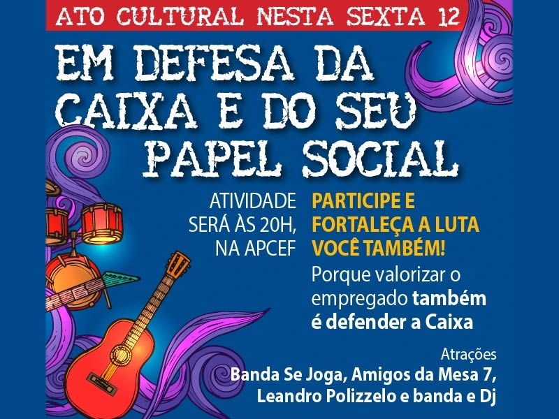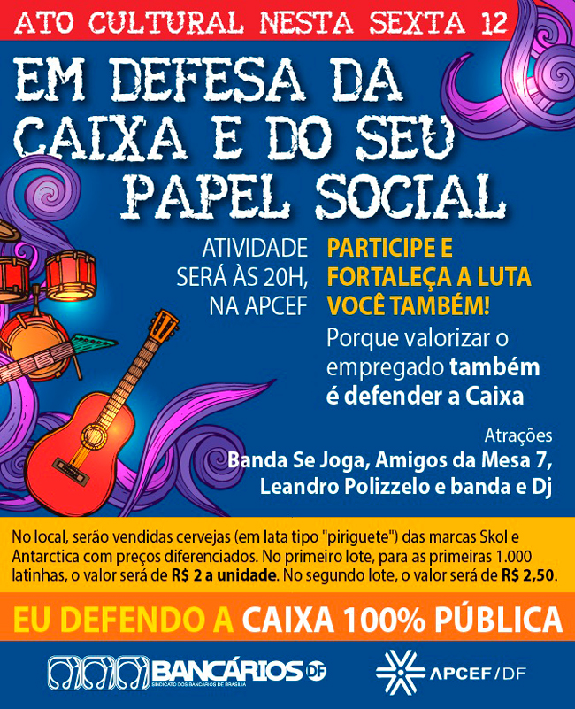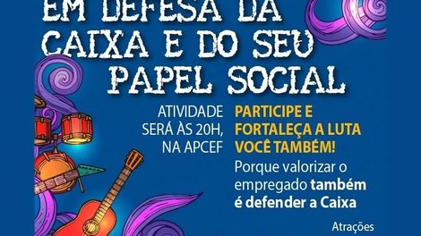 Para marcar a data, o Sindicato convoca os empregados para um ato cultural que será promovido na sexta-feira, às 20h, na Apcef (Associação do Pessoal da Caixa Econômica Federal), no Setor de Clubes Esportivos Norte.