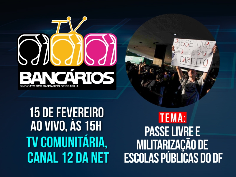 A edição do programa TV Bancários desta sexta-feira (15) apresenta uma discussão sobre a militarização de escolas públicas do DF e sobre o ataque do governador Ibaneis Rocha ao passe livre estudantil, regulado pela Lei Distrital nº 4.462/2010. O programa será transmitido ao vivo a partir das 15h pelas redes sociais do Sindicato e pela TV Comunitária de Brasília (canal 12 da Net).