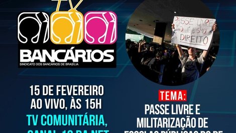A edição do programa TV Bancários desta sexta-feira (15) apresenta uma discussão sobre a militarização de escolas públicas do DF e sobre o ataque do governador Ibaneis Rocha ao passe livre estudantil, regulado pela Lei Distrital nº 4.462/2010. O programa será transmitido ao vivo a partir das 15h pelas redes sociais do Sindicato e pela TV Comunitária de Brasília (canal 12 da Net).