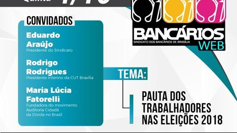 Dias antes de brasileiras e brasileiros irem às urnas, o programa TV Bancários Web apresenta um debate sobre a pauta da classe trabalhadora nas Eleições 2018. O programa começa às 17h e recebe o presidente do Sindicato, Eduardo Araújo, a fundadora do movimento Auditoria Cidadã da Dívida no Brasil, Maria Lúcia Fatorelli e o presidente interino da CUT Brasília, Rodrigo Rodrigues.