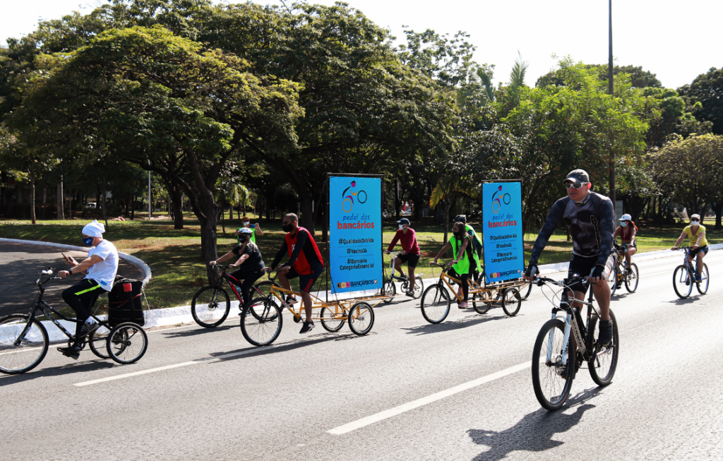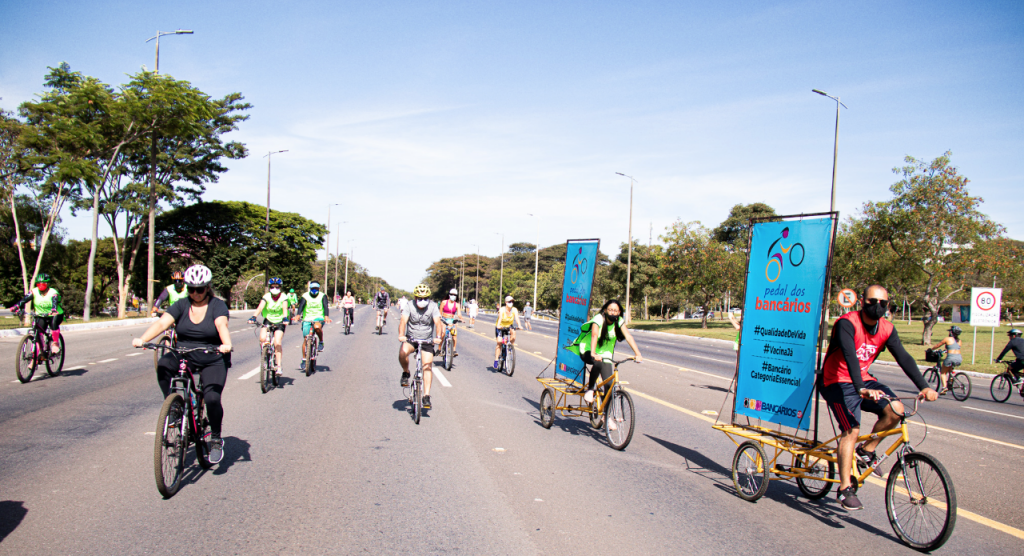 Movimentar o corpo, espairecer a mente e lutar por direitos. Esse foi o espírito do Pedal dos Bancários, cuja primeira edição foi promovida pelo Sindicato no feriado de quinta-feira (3). A atividade percorreu todo o Eixão Sul e reuniu bancários, bancárias e seus familiares para um momento de lazer e integração, respeitando rigorosamente todos os protocolos de prevenção à Covid-19.
