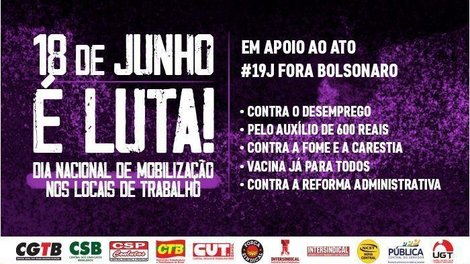 E para reforçar o 'Fora Bolsonaro', a CUT apoia as manifestações que estão sendo organizadas pelas frentes Brasil Popular e Povo sem Medo para o dia 19 de junho, sábado da semana que vem. A CUT é uma das impulsionadoras da Campanha Nacional Fora Bolsonaro, por fazer parte das Frentes Brasil Popular, Povo Sem Medo e do Fórum das centrais sindicais.