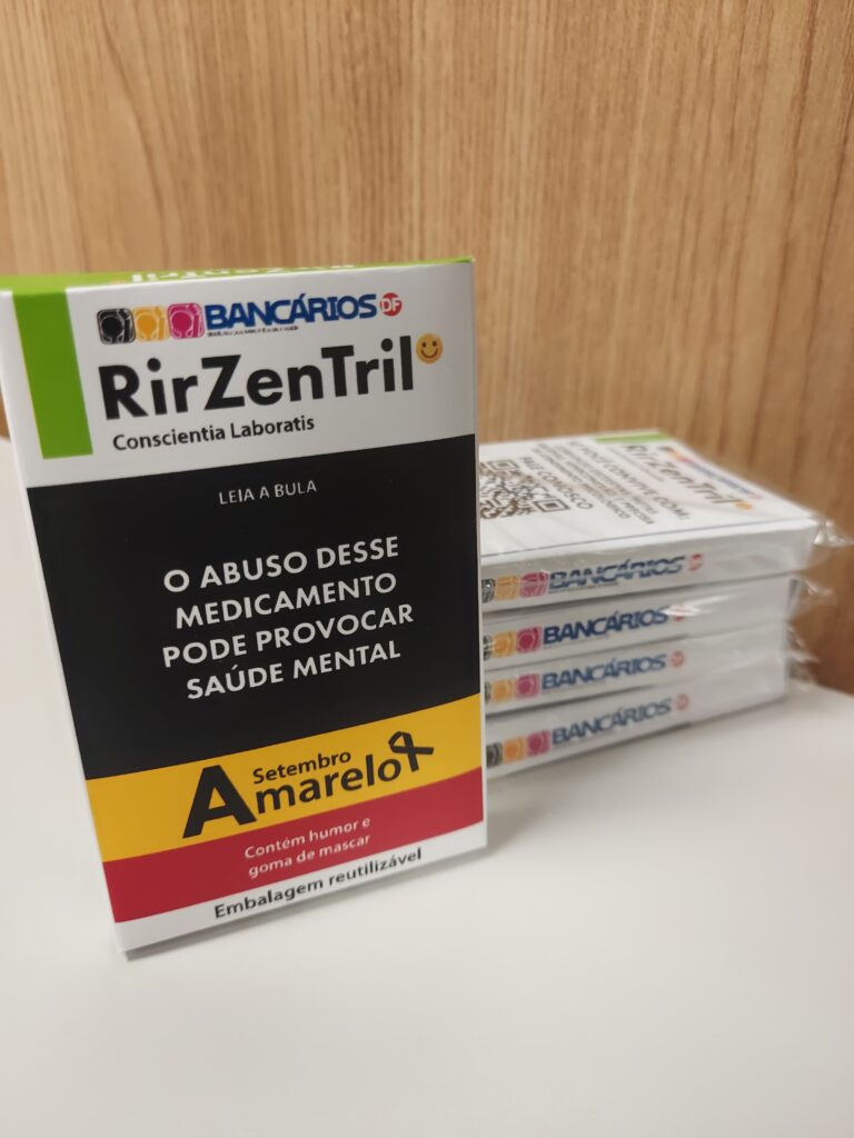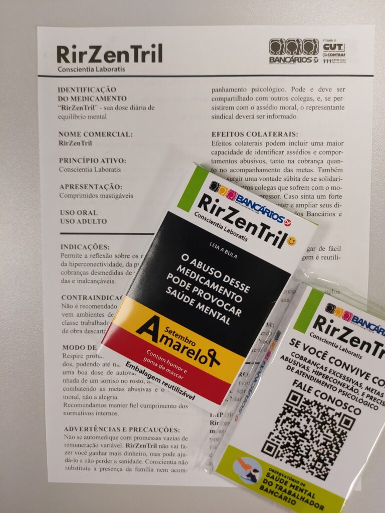 Num esforço para conscientizar o bancário também para o cuidado com o seu bem-estar físico, mental e social, o Sindicato, também como parte da campanha Menos Metas, Mais Saúde, está distribuindo aos bancários e bancárias nos locais de trabalho o “medicamento” RirZenTril – uma caixinha com gomas de mascar que leva esse nome numa paródia do conhecidíssimo tarja preta Rivotril, prescrito em casos de ansiedade, entre outros transtornos mentais.