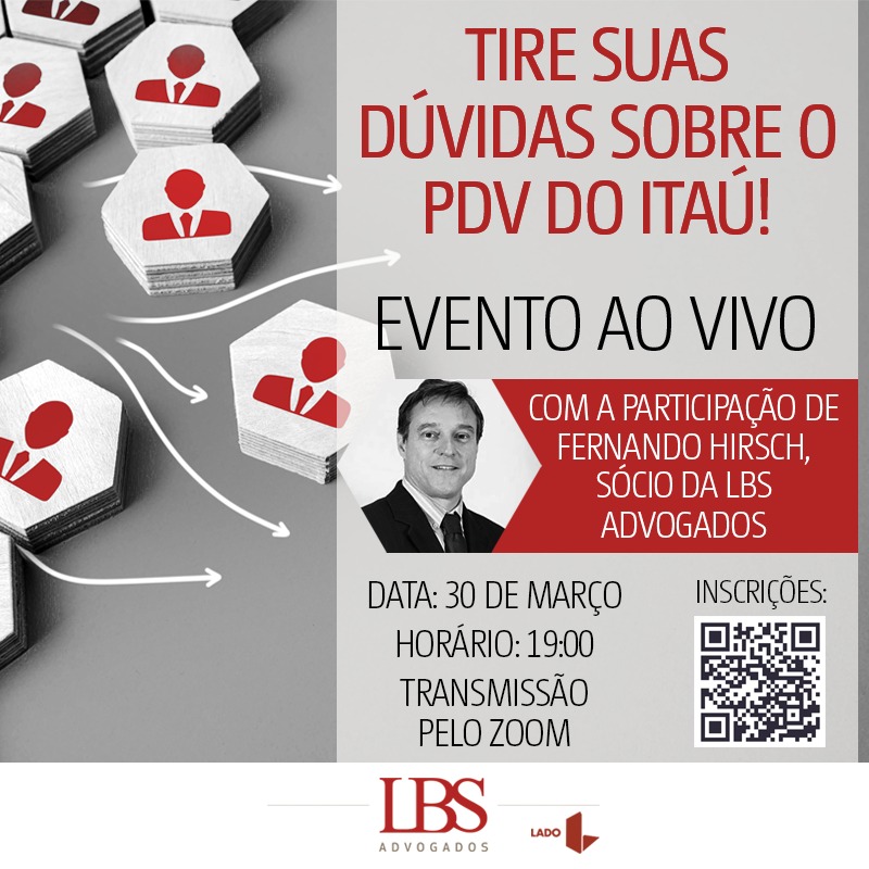 Para reforçar os esclarecimentos sobre o PDV, a LBS, que presta assessoria jurídica ao Sindicato, realiza live nesta quarta-feira (30), às 19h, pela plataforma Zoom, com o advogado Fernando Hirsch. Inscrições podem ser feitas pelo link: https://materiais.lbs.adv.br/evento-pdv-do-itau.