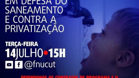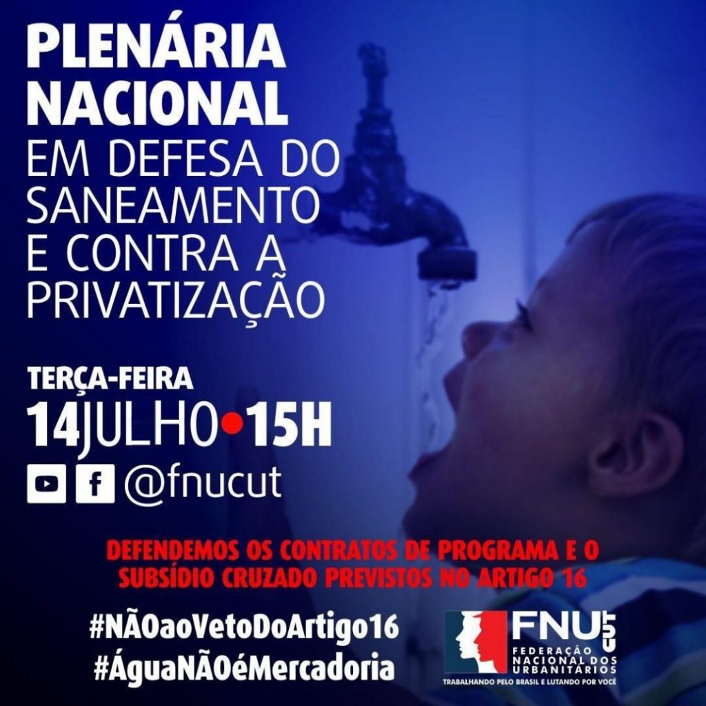 A Federação Nacional dos Urbanitários (FNU) realizará nesta terça-feira 14 Plenária Nacional em Defesa do Saneamento e Contra a Privatização. A atividade, que será virtual, será transmitida pelas páginas da Federação no Facebook e no Youtube, às 15h.