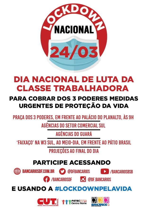 O lockdown da classe trabalhadora no DF terá ato virtual com lideranças sindicais e populares, artistas e parlamentares, às 20h, com transmissão pelas redes sociais do Sindicato e pela TV Comunitária de Brasília (canal 12 da Net).