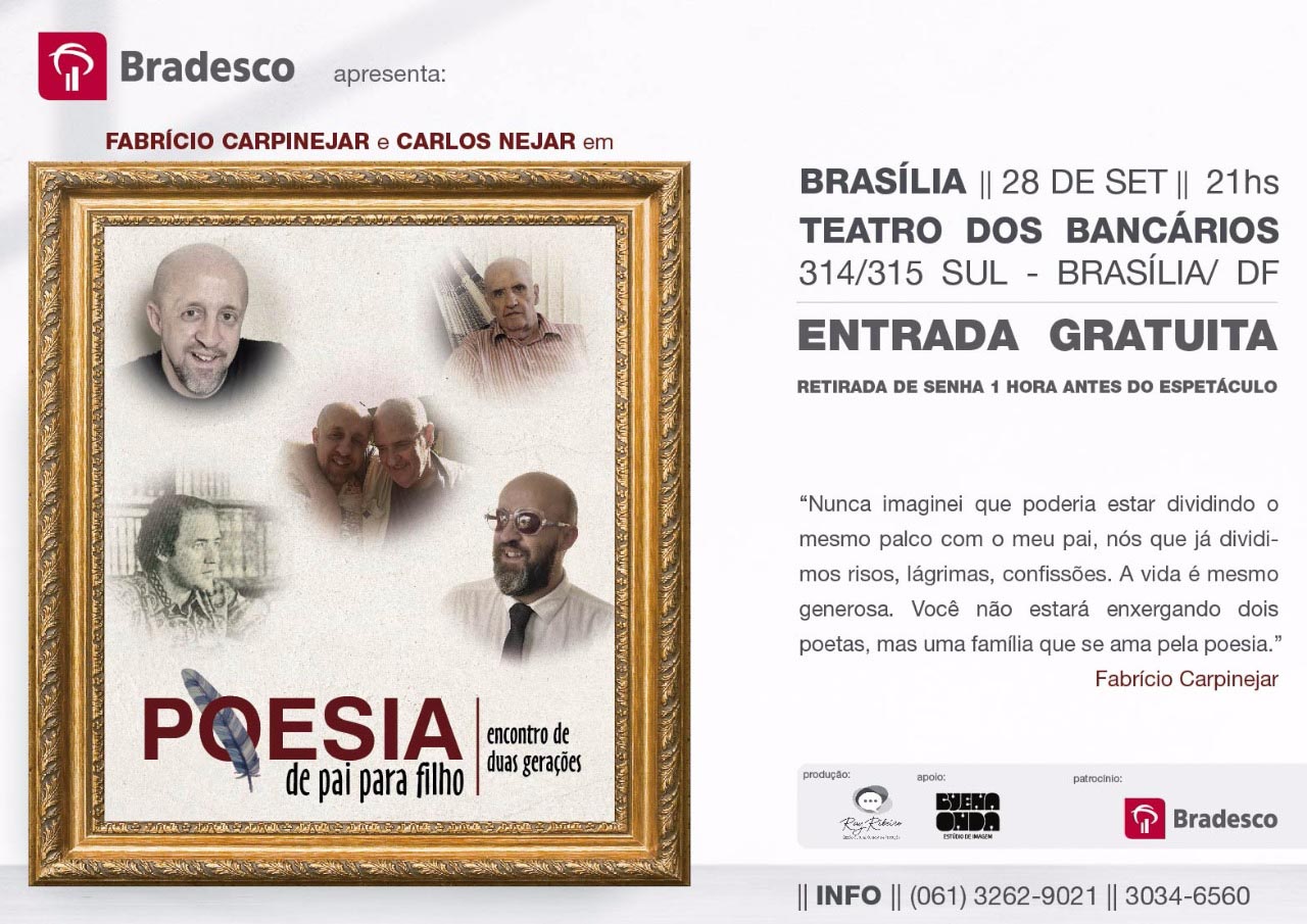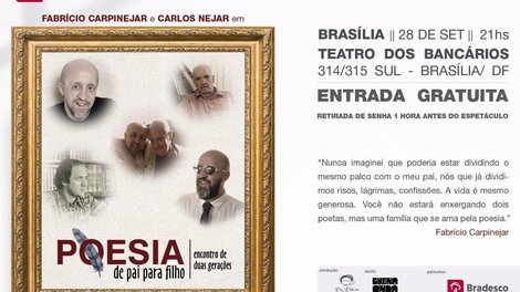 Os escritores, poetas, pai e filho, Carlos Nejar e Fabrício Carpinejar celebram 20 e 60 anos de carreira literária, respectivamente, com o espetáculo “Poesia de Pai Para Filho - Encontro de Duas Gerações”, que estréia nesta sexta-feira (28), às 21h, no Teatro dos Bancários. A entrada é gratuita