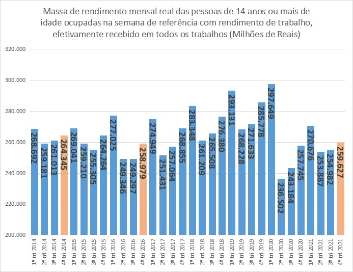 O volume da participação dos salários dos trabalhadores no Produto Interno Bruto (PIB), caiu 12,9% em cinco anos. Como o PIB varia ano a ano, em 2016, o valor da massa salarial em comparação com o PIB representava 35,5%, e em 2021 essa comparação despencou para 31%. Foi o pior resultado em 16 anos. No mesmo período a participação do excedente operacional bruto das empresas, valor de onde as companhias extraem o lucro, aumentou de 32,3% para 37,5%, representando um crescimento de 16% entre 2016 e 2021.