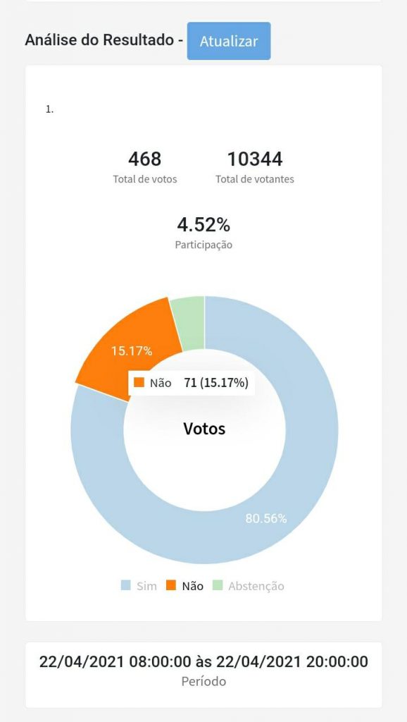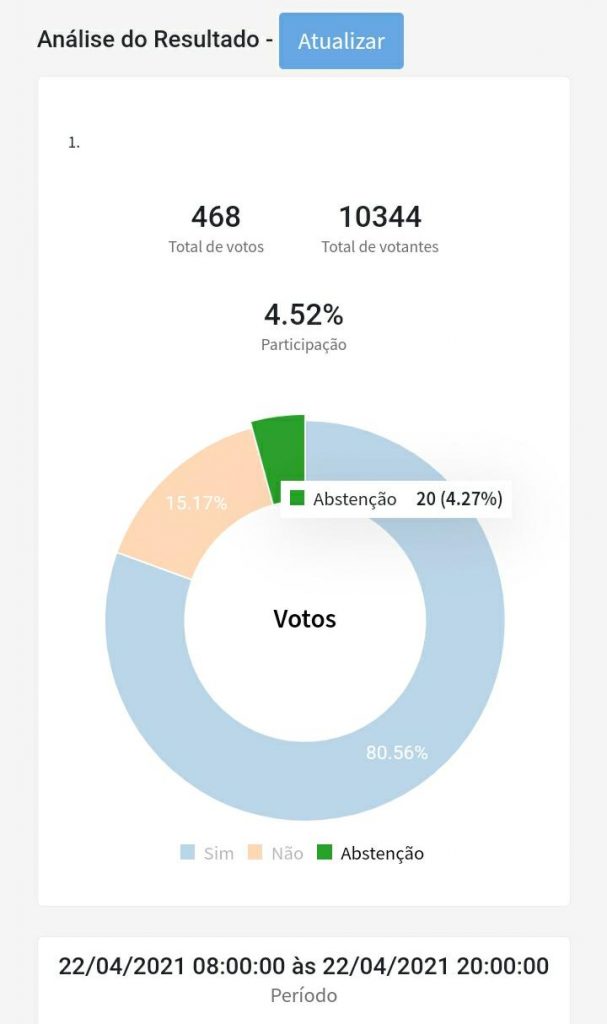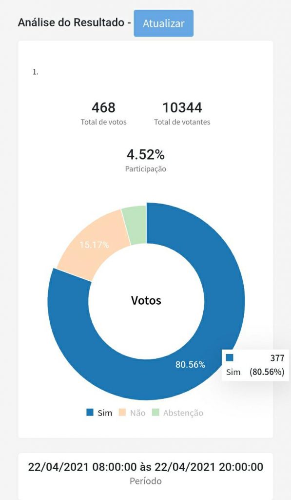 Do total de participantes da votação virtual, que teve início às 8h e terminou às 20h, 80,56% disseram ‘sim’ à participação na greve. Votos ‘não’ somaram 15,17%, e abstenções foram 4,27%.
