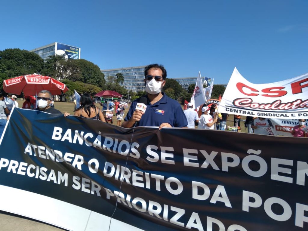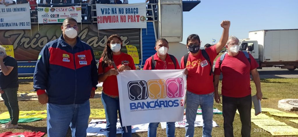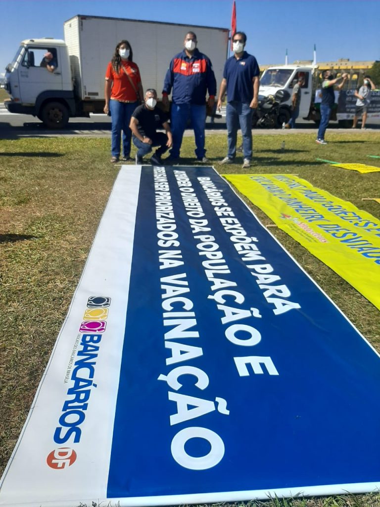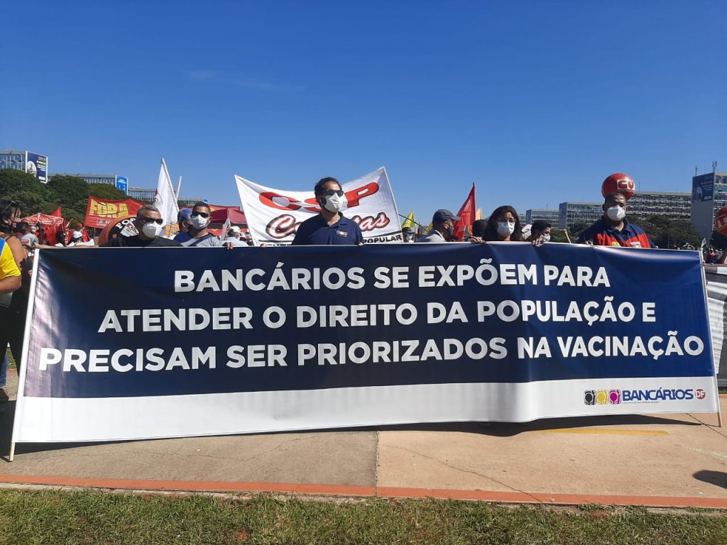 Bancárias e bancários engrossaram o ato na capital federal. Diretores do Sindicato e da Federação dos Bancários do Centro Norte (Fetec-CUT/CN) estamparam cartazes e faixas cobrando vacinação para todos e todas, além de reivindicarem atenção à categoria que, em meio à crise, se expõe para atender a população.