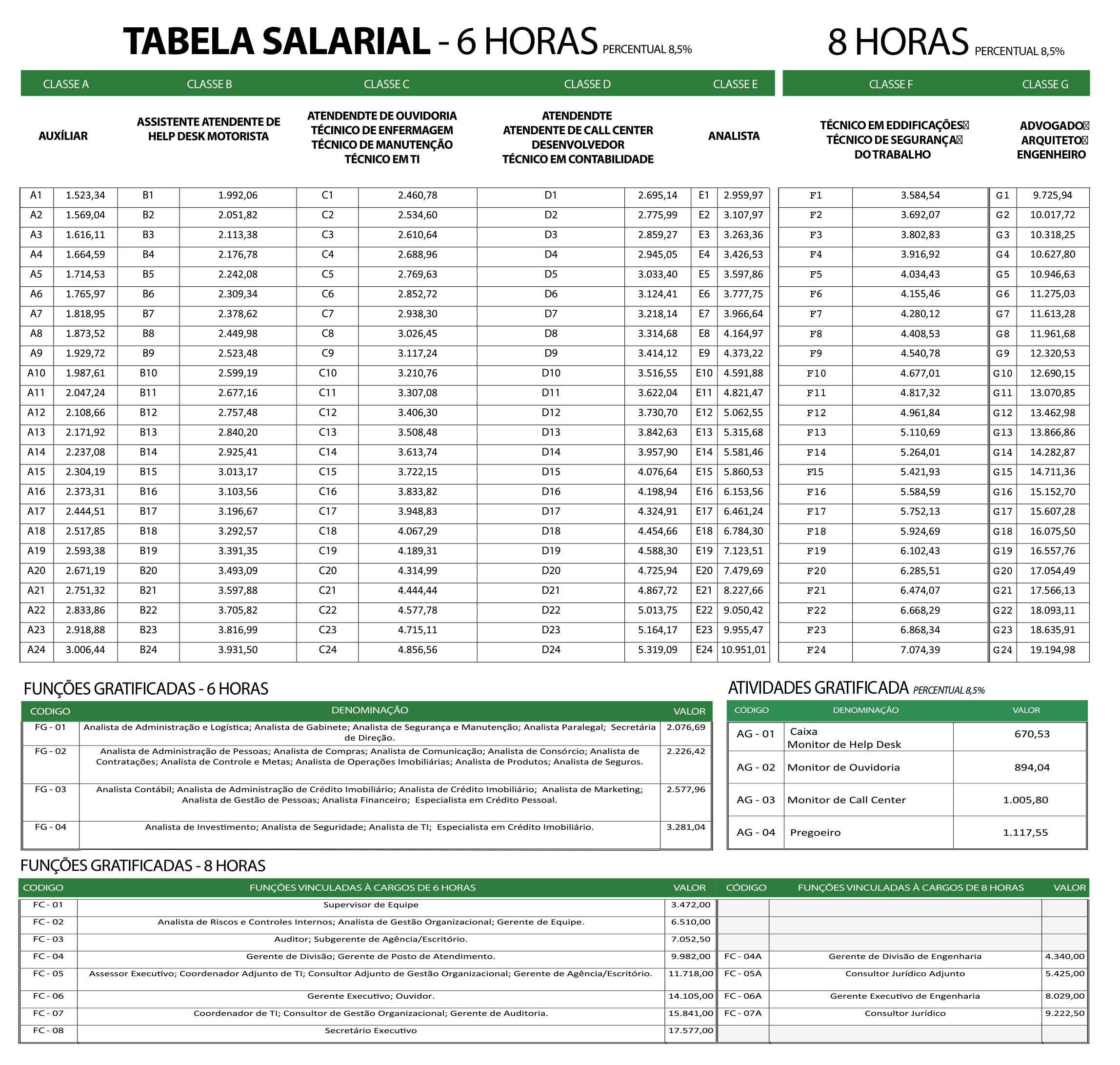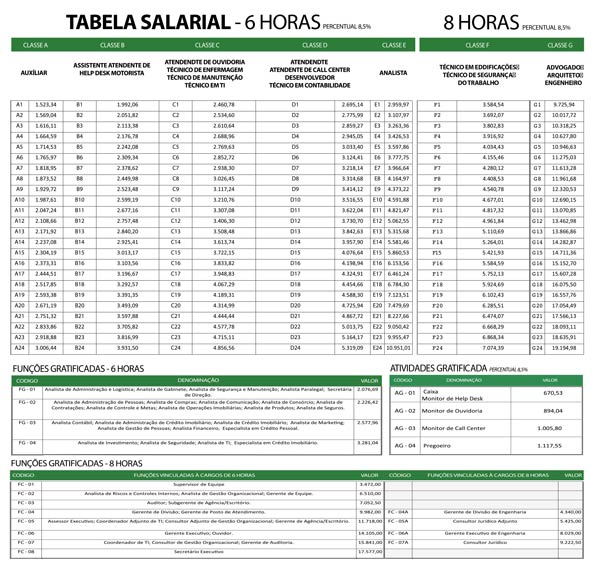Seguem as tabelas de vencimentos e de funções/gratificações já reajustadas com os índices da campanha salarial.