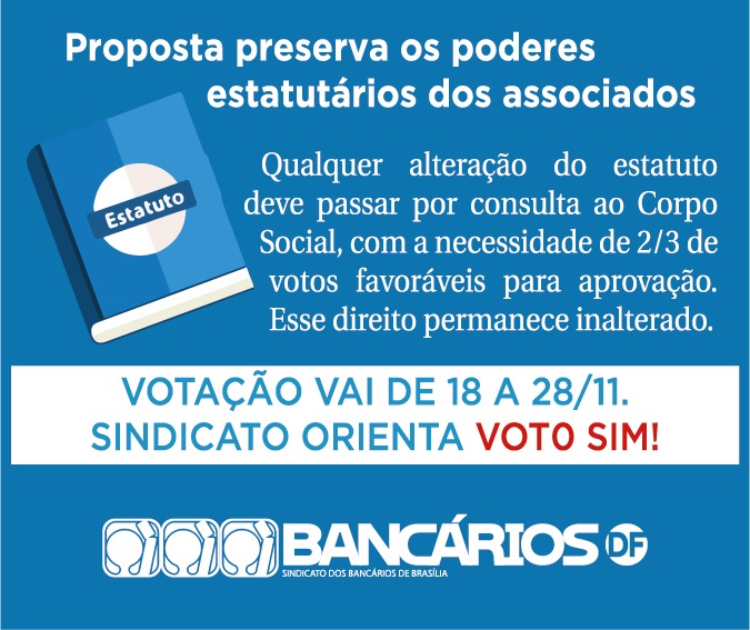 Entre os dias 18 e 28 de novembro, o Corpo Social da Caixa de Assistência dos Funcionários do Banco do Brasil (Cassi) será consultado sobre a proposta de sustentabilidade da entidade elaborada e aprovada pela direção do plano. O Sindicato dos Bancários de Brasília orienta o voto SIM na proposta.