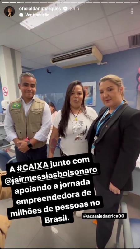 Durante sua visita à agência da Praça da Revolução, em Salvador, acompanhada do ministro da Cidadania, Ronaldo Bento, Daniella Marques publicou vários vídeos em suas redes sociais enaltecendo Bolsonaro. Os vídeos foram publicados entre 10 e 12 horas. Inclusive, em um deles, a presidente da Caixa fez questão de marcar o presidente Bolsonaro, fazendo o seu papel de boa cabo eleitoral.
