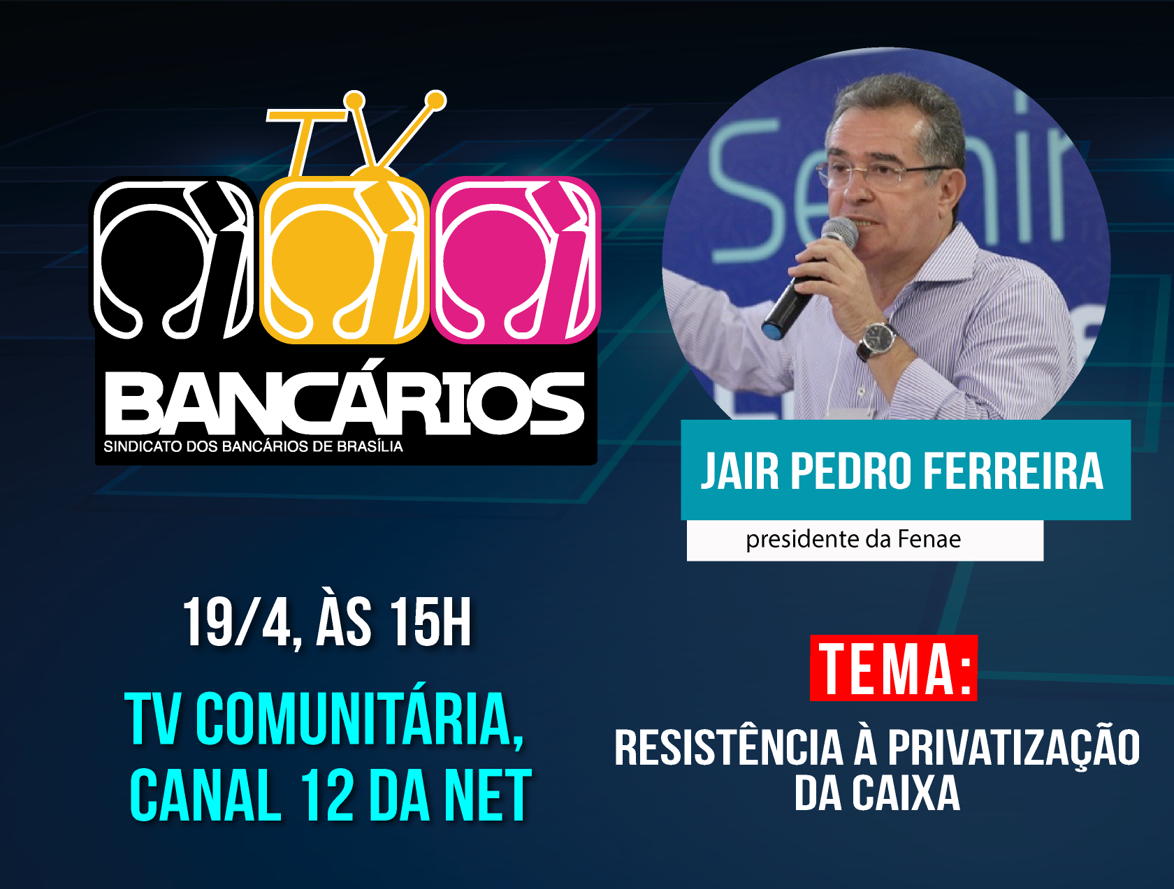 O entrevistado será o bancário da Caixa e presidente da Fenae (Federação Nacional das Associações do Pessoal da Caixa Econômica Federal), Jair Pedro Ferreira.